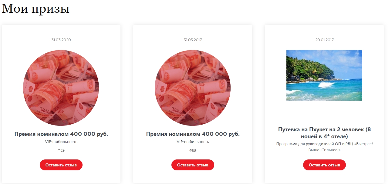 Здесь вы увидите полученные вами призы от Компании, сможете оставить отзыв о них.